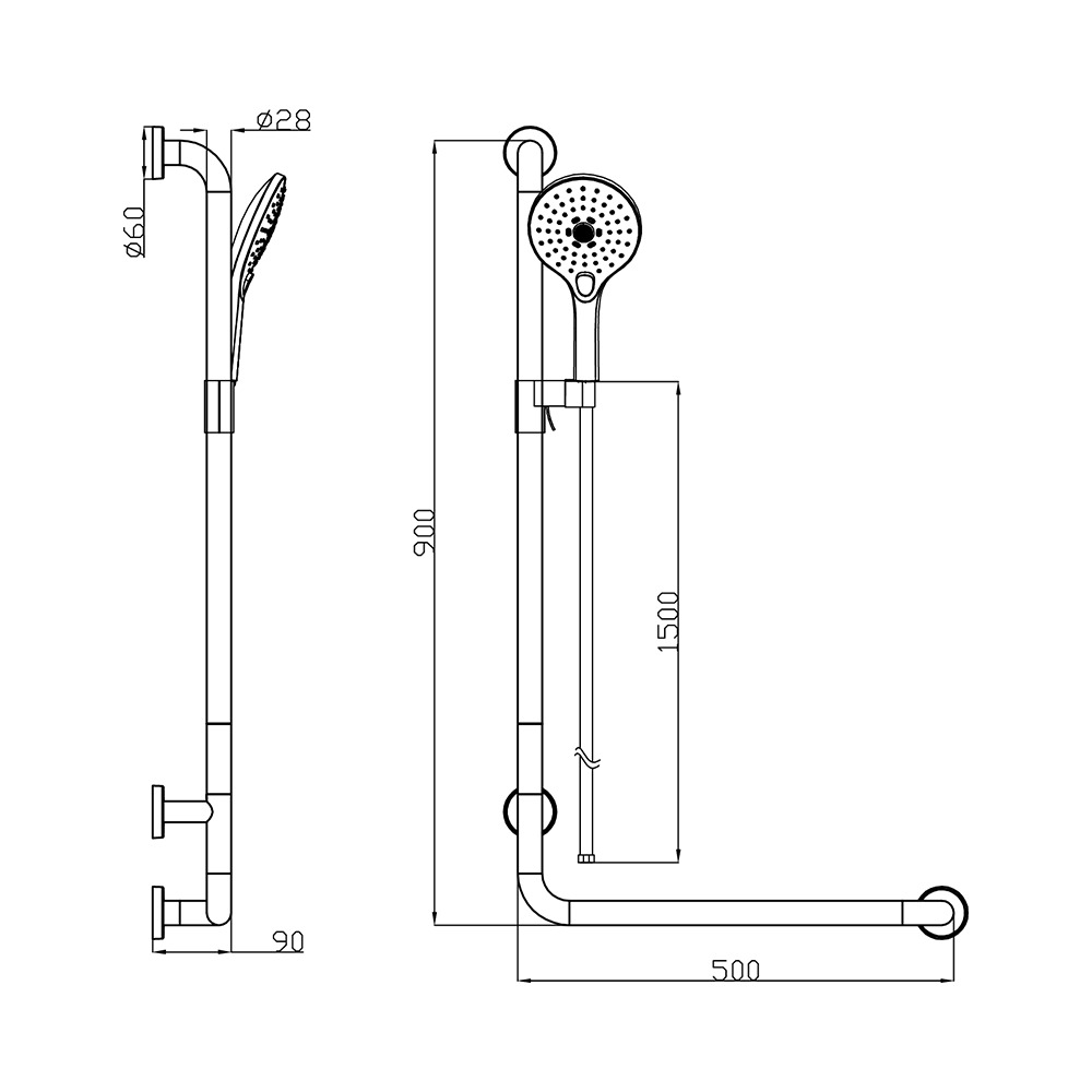 Incluye una barra de soporte horizontal de 500 mm de largo con placas terminales resistentes (espaciado de 90 mm entre soportes), que proporciona estabilidad segura para mayor seguridad y equilibrio en entornos húmedos.